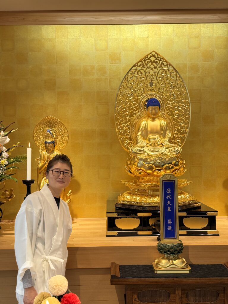 今月の工房では、箔押師の手によって金色に輝いた姿となって戻ってきた、1尺5寸の阿弥陀如来座像の台座・光背・ご本尊の最終組み立てを行い、広島のお寺へ皆さまの前でお納めしてまいりました。開眼法要にも出席させていただき、ありがたい経験となりました。